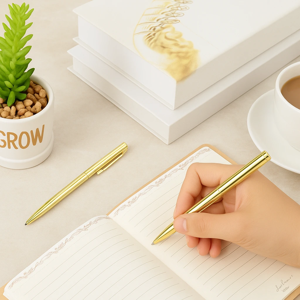 Regálate a ti mismo un bolígrafo exclusivo que refleje tu estilo. Un accesorio dorado y grabado con tu nombre no solo es útil, sino que también es una declaración de identidad.