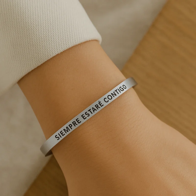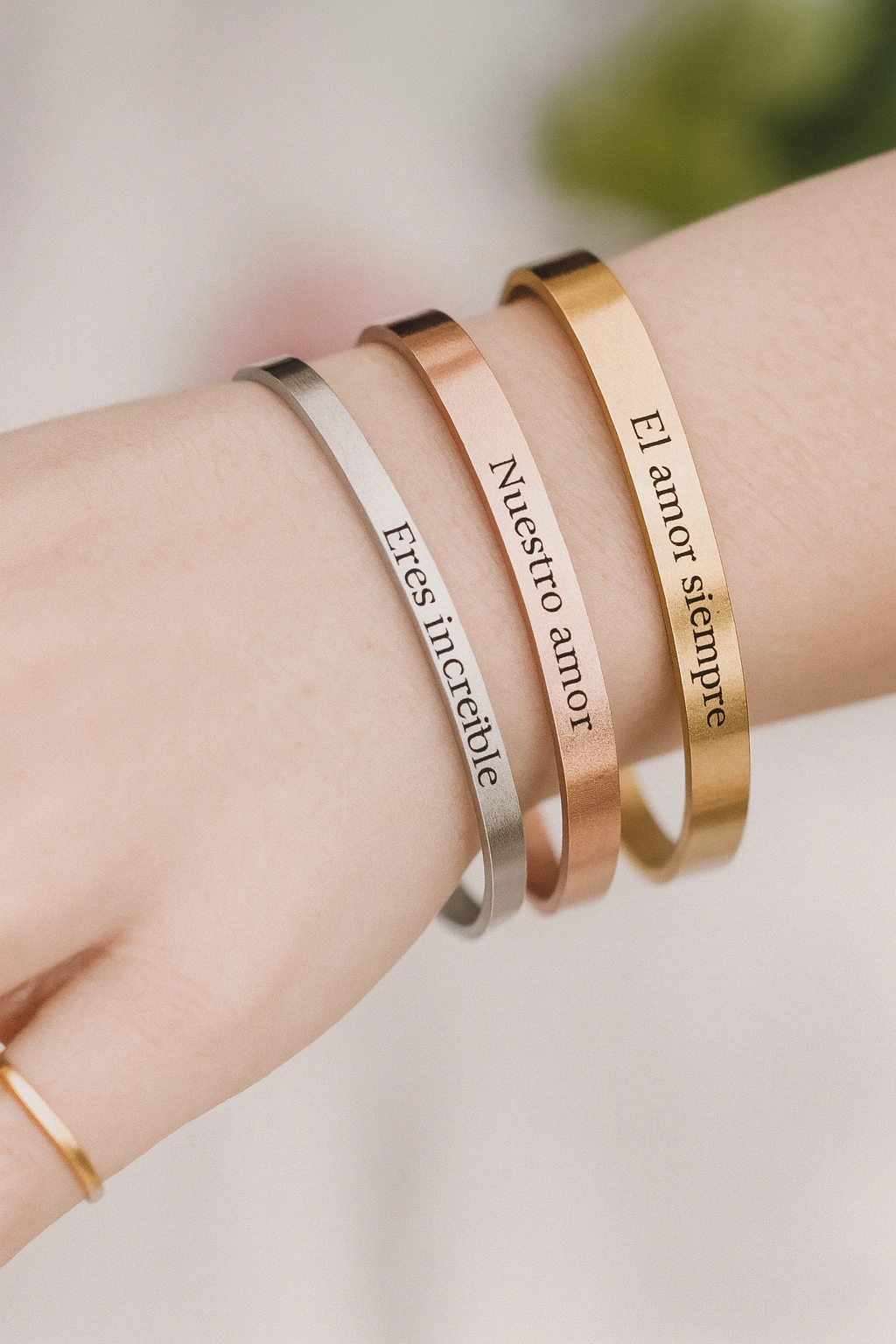Una de las principales razones por las que los brazaletes grabados se han vuelto tan populares es la capacidad de personalizar completamente el diseño. Puedes grabar lo que desees, ya sea una fecha especial, nombres, iniciales, frases motivadoras, o cualquier otro mensaje que tenga significado para ti. La personalización no solo hace que el brazalete sea más significativo, sino que también lo convierte en una pieza única, sin igual en el mercado.