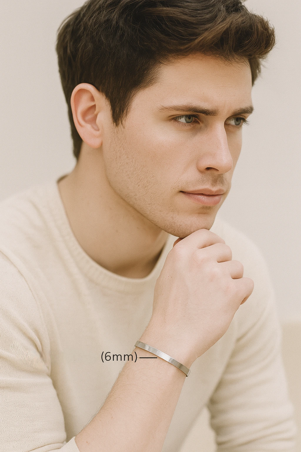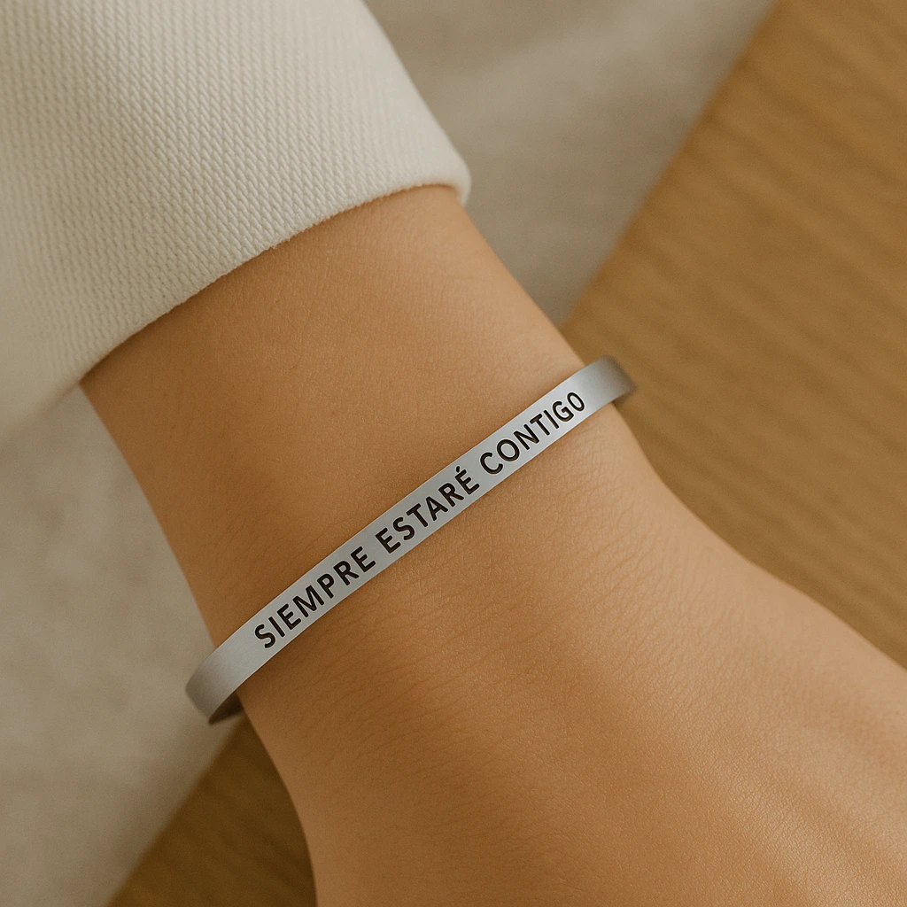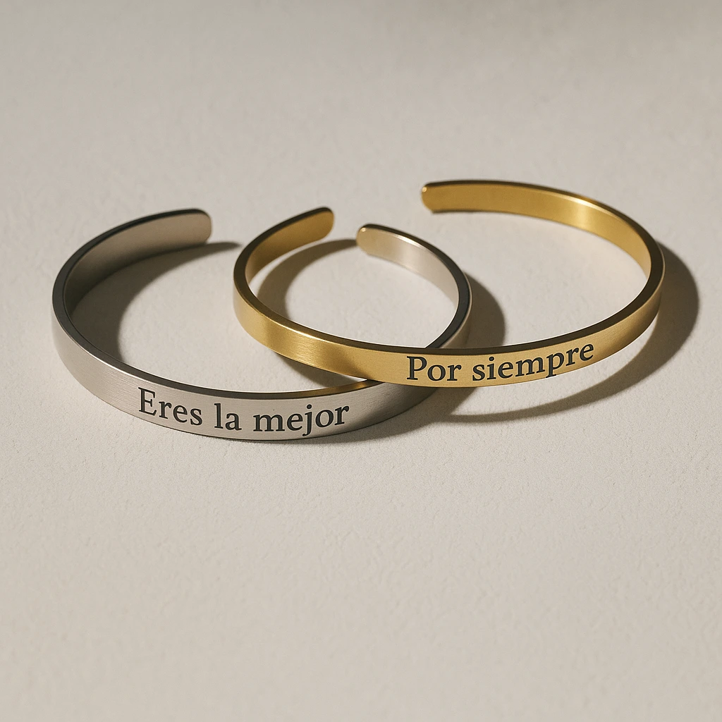 Un brazalete personalizado grabado a láser es un accesorio de joyería creado con acero inoxidable de alta calidad y grabado con tecnología de grabado láser. Este proceso permite crear diseños o mensajes con una precisión extrema, lo que garantiza que cada brazalete sea único y especial. Gracias a este método, puedes grabar nombres, fechas importantes, iniciales, o cualquier mensaje significativo en la superficie del brazalete, sin perder detalle ni claridad.